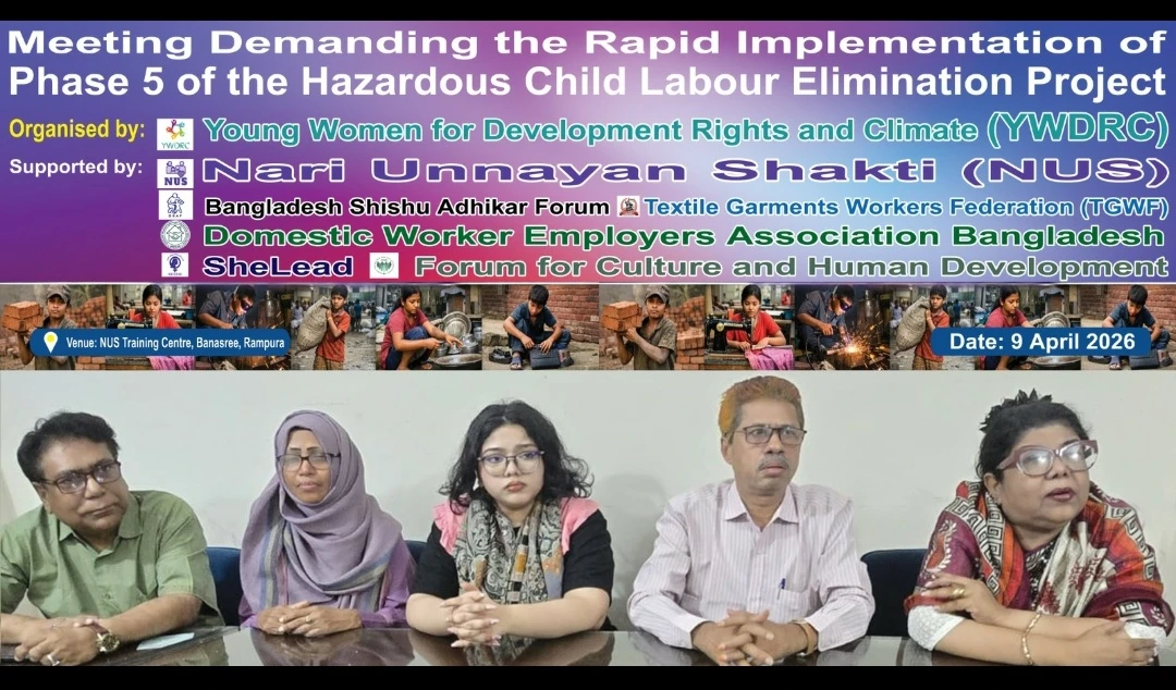 এই প্রেক্ষাপটে “ঝুঁকিপূর্ণ শিশু শ্রম নির্মূল প্রকল্প”-এর পঞ্চম ধাপ দ্রুত বাস্তবায়নের দাবিতে একটি গুরুত্বপূর্ণ সভা অনুষ্ঠিত হয়। সভাটির আয়োজন করে ইয়াং উইমেন ফর ডেভেলপমেন্ট রাইটস অ্যান্ড ক্লাইমেট (ওয়াই ডাবলু ডি আর সি) এবং এতে সহযোগিতা প্রদান করে নারী উন্নয়ন শক্তি (এন ইউ এস), বাংলাদেশ শিশু অধিকার ফোরাম (বিএসএএফ) টেক্সটাইল গার্মেন্টস ওয়ার্কার্স ফেডারেশন (টিজিডাবলুএফ), ডোমেস্টিক ওয়ার্কার এমপ্লয়ার্স অ্যাসোসিয়েশন বাংলাদেশ(ডিডাবলুইএ), শি-লিড এবং ফোরাম ফর কালচার অ্যান্ড হিউম্যান ডেভেলপমেন্ট (এফসিএইচডি)।