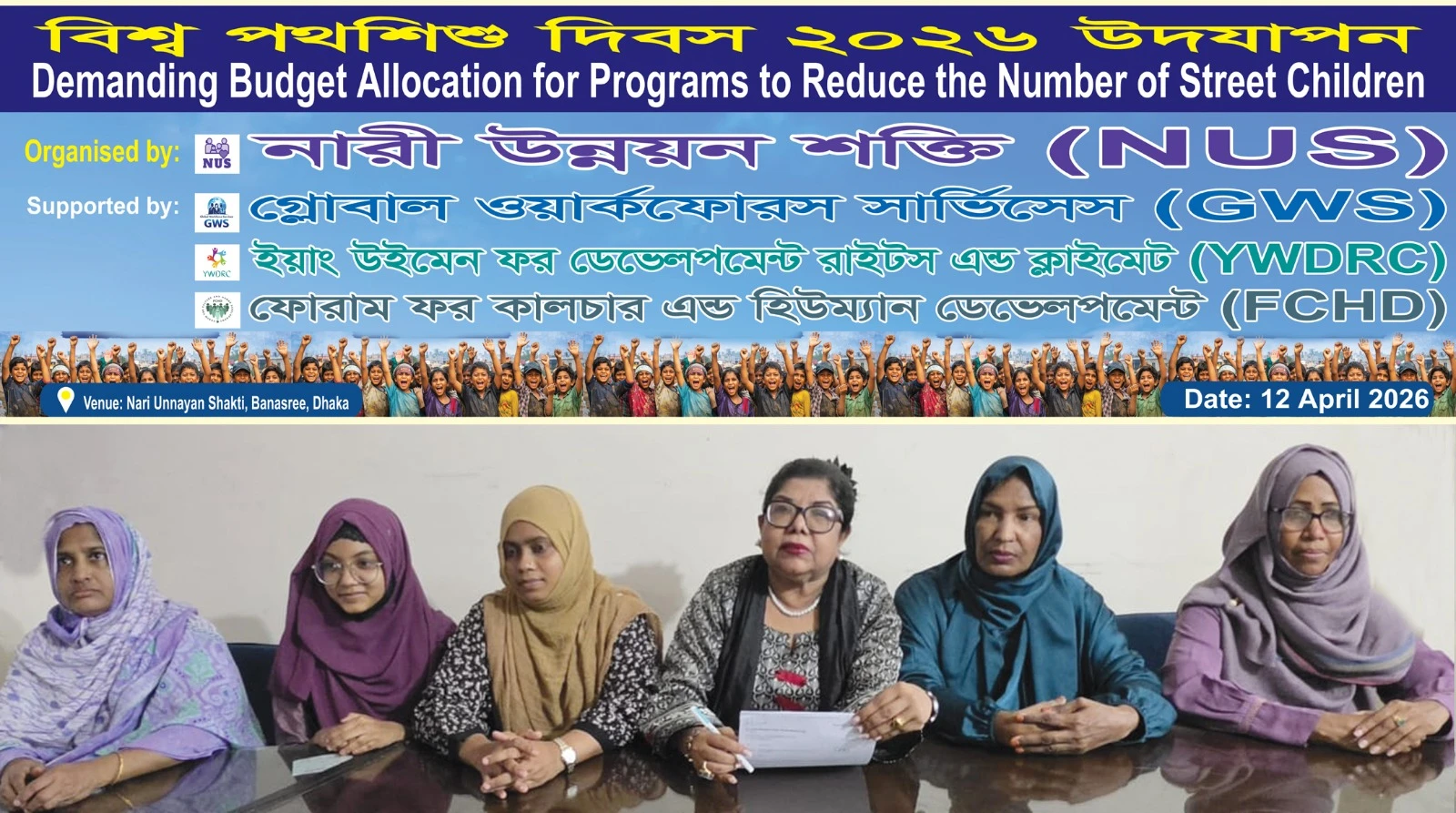 নারী উন্নয়ন শক্তি (এনইউএস) এর উদ্যোগে বনশ্রী, ঢাকায় বিশ্ব পথশিশু দিবস ২০২৬ উপলক্ষে একটি গুরুত্বপূর্ণ আলোচনা সভা অনুষ্ঠিত হয়। সভাটির মূল প্রতিপাদ্য বিষয় ছিল, পথশিশুদের সংখ্যা কমিয়ে আনতে সরকারের বাস্তবভিত্তিক কর্মসূচি গ্রহণ এবং এ খাতে পর্যাপ্ত বাজেট বরাদ্দ নিশ্চিত করা। সুবিধা বঞ্চিত শিশুদের মায়েদের নিয়ে এই আলোচনা সভার আয়োজন করা হয়। সভা ১২ এপ্রিল ২০২৬ তারিখ অনুষ্ঠিত হয়।