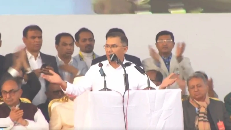 বেলা ৩টা ৫০ মিনিটের দিকে তারেক রহমান মঞ্চে ওঠেন। বেলা ৩টা ৫৭ মিনিটে তিনি বক্তব্য শুরু করেন। শুরুতেই বলেন, ‘প্রিয় বাংলাদেশ।’ তার সঙ্গে মঞ্চে আছেন বিএনপিসহ আরো বেশ কয়েকজন জাতীয় নেতা। মঞ্চে উঠে নেতাকর্মীদের উদ্দেশে হাত নাড়েন তারেক রহমান।